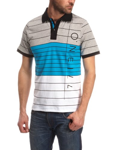 The Tube polo shirt from O'Neill features a colour-block design in grey, blue and white colour ways. The colour blocks are broken with thin black horizontal lines. The stripes compliment the solid black collar, placket and sleeves. The Tube polo shirt features a two-button placket with O'Neill branded buttons. This mens blue polo tee is made from pure cotton and has a ribbed collar and sleeves.